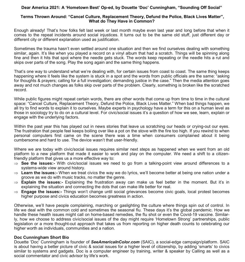 You can join the conversation and support our efforts with SAICs “Dear America 2021” Letters and Impact Statement at the Facebook ‘Hometown Chat’ Page here http://www.Facebook.com/seeamericaincolor.