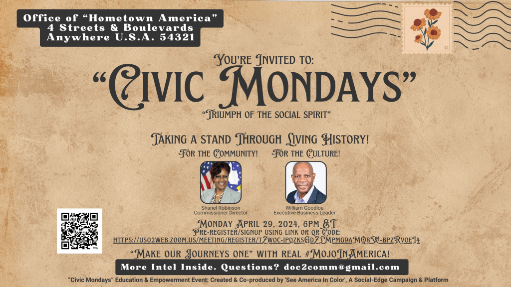 Chime-in on impacting Democracy & Public Good, Education & Community or Entrepreneurship & American Dream, ‘Civic Mondays’ events or Civics & Community forums. Plus, you can “J.A.M. With Us” (join a movement) in civic engagement, social change and community life. Checkout the Signup Center below.